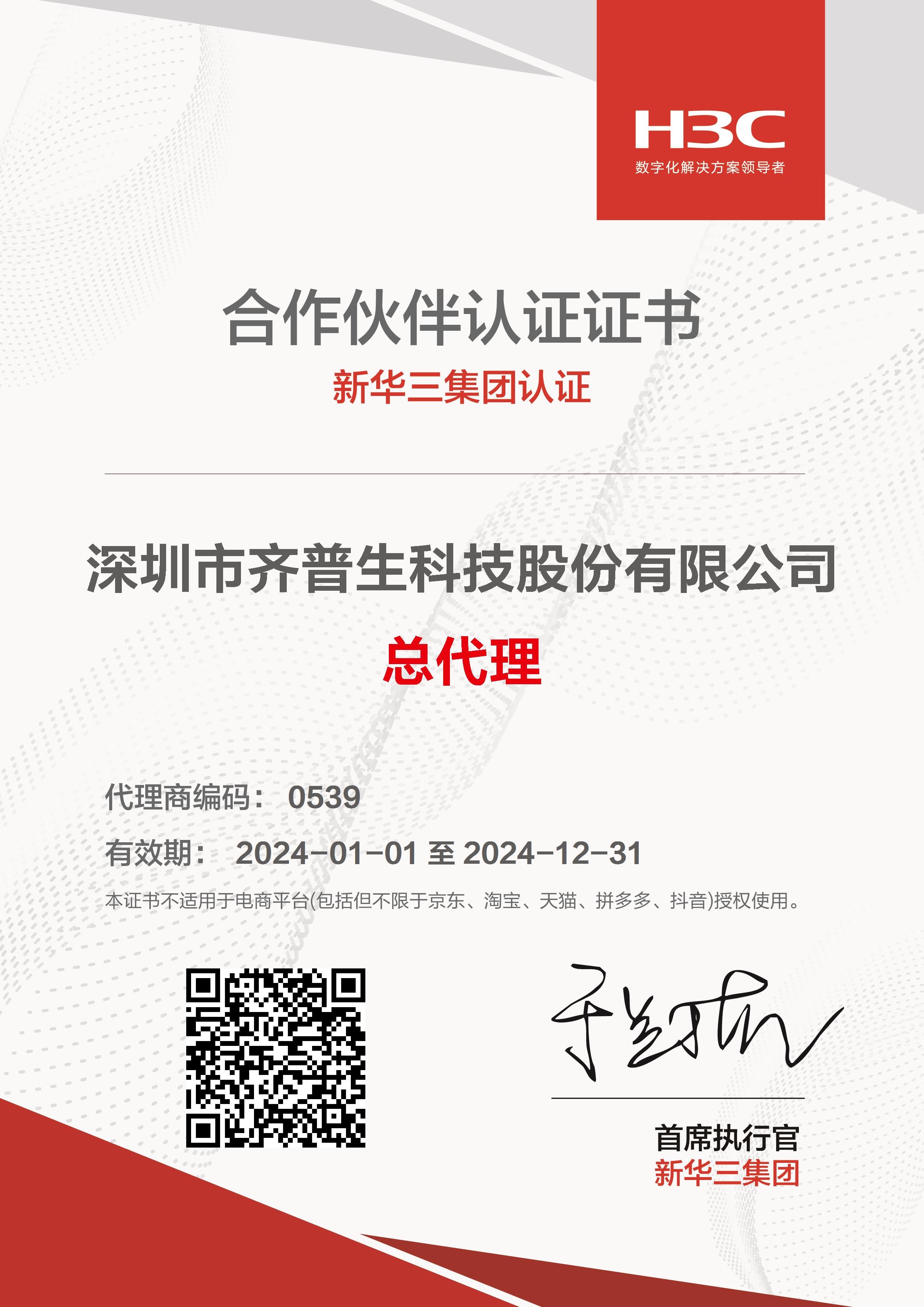 • 2024年H3C總代證書